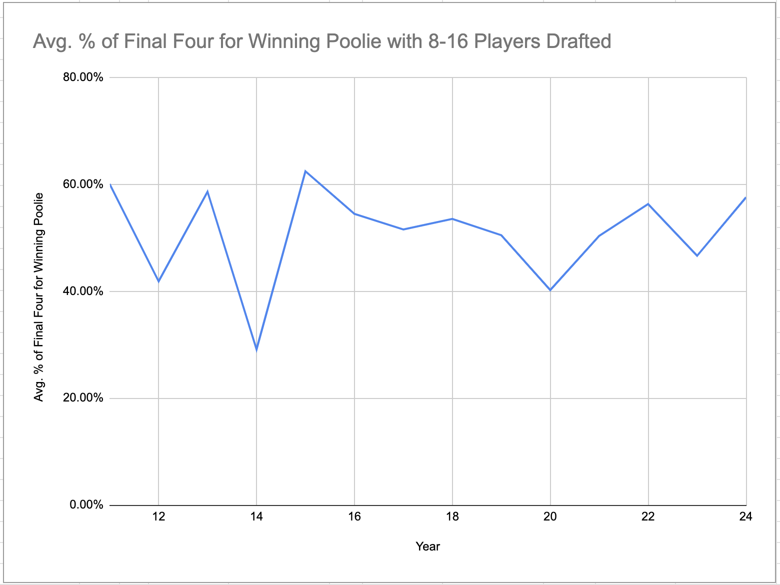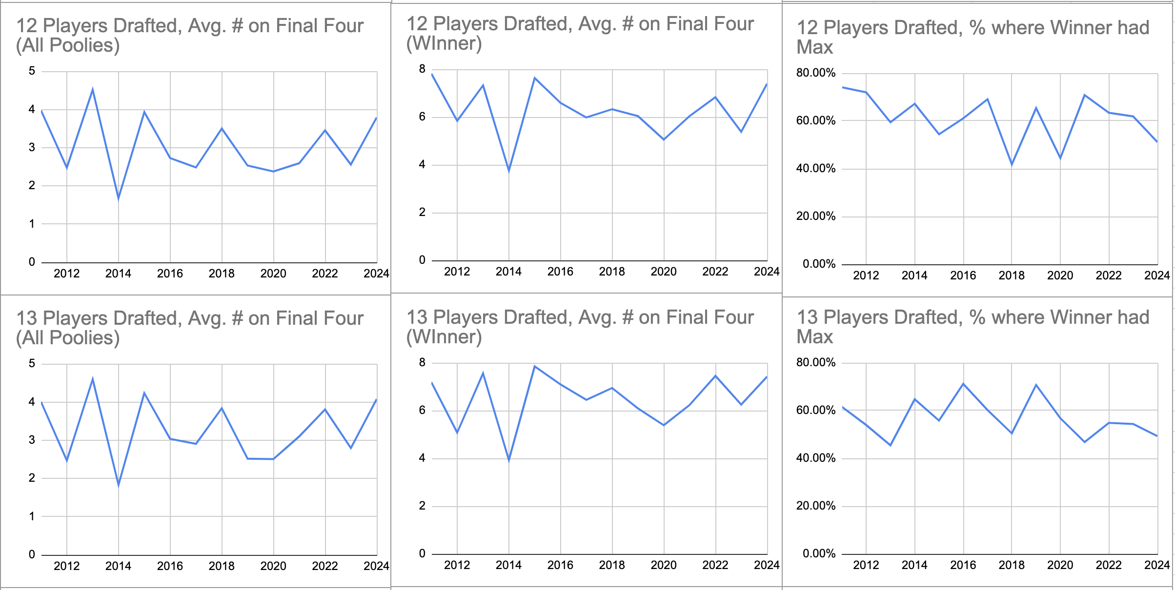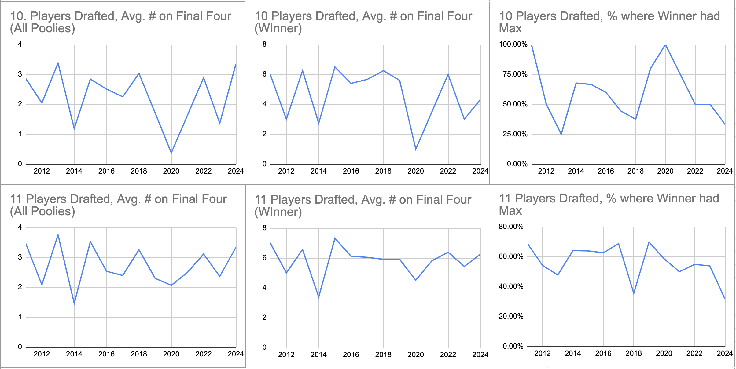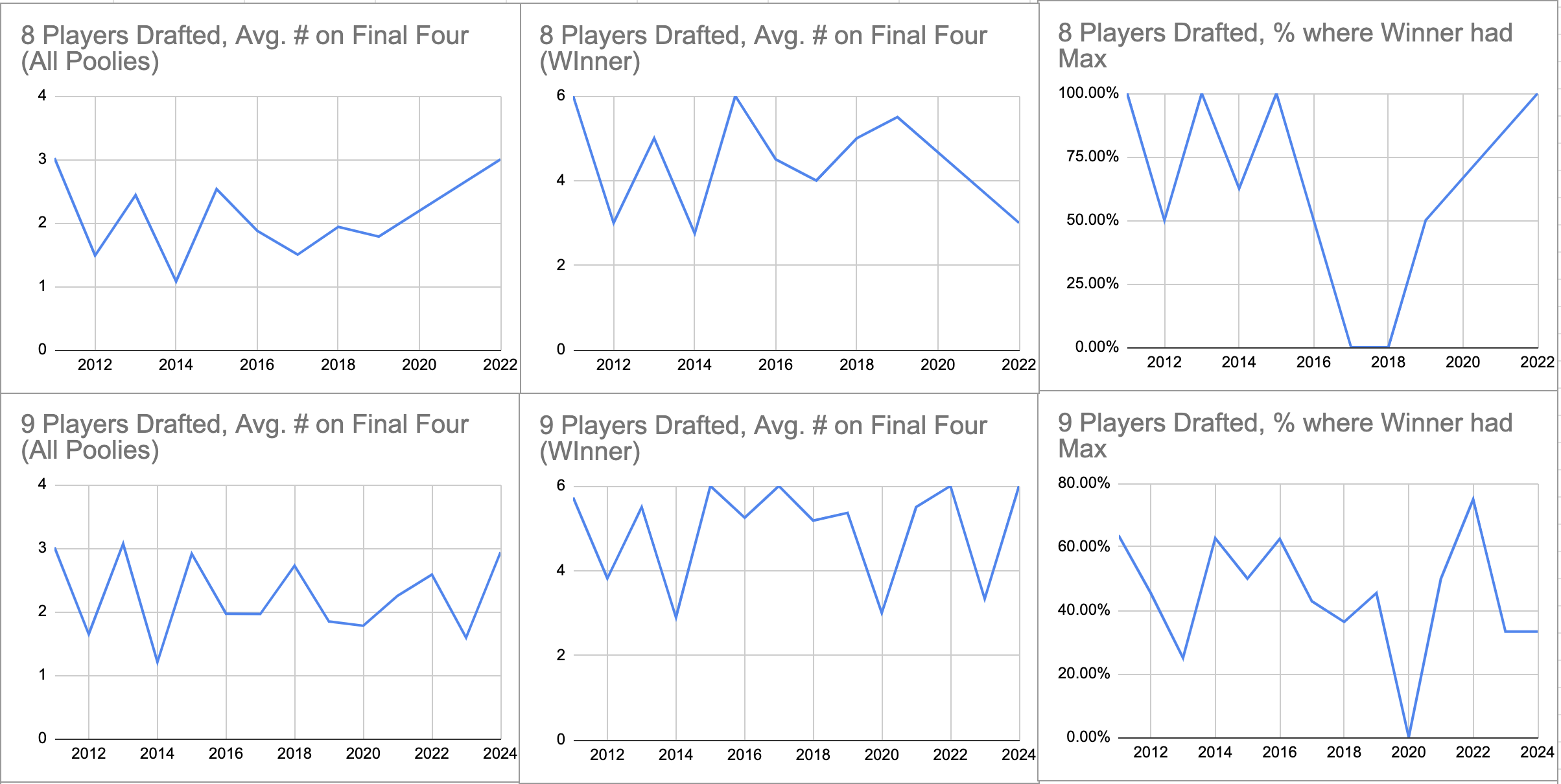 To try to answer this, we looked at the number of players each Poolie drafted from the final four on each pool, and computed the average number of final four on all teams in each pool, then averaged that result from all pools.