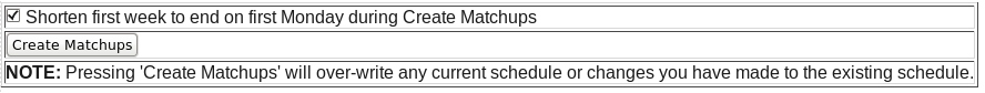 On that page, you can create an initial head-to-head weekly schedule for your pool. Since the first games of the season are generally on Wednesdays, clicking the check box to Shorten first week to end on first Monday during Create Matchups is recommended. Once the check box is selected, press Create Matchups.