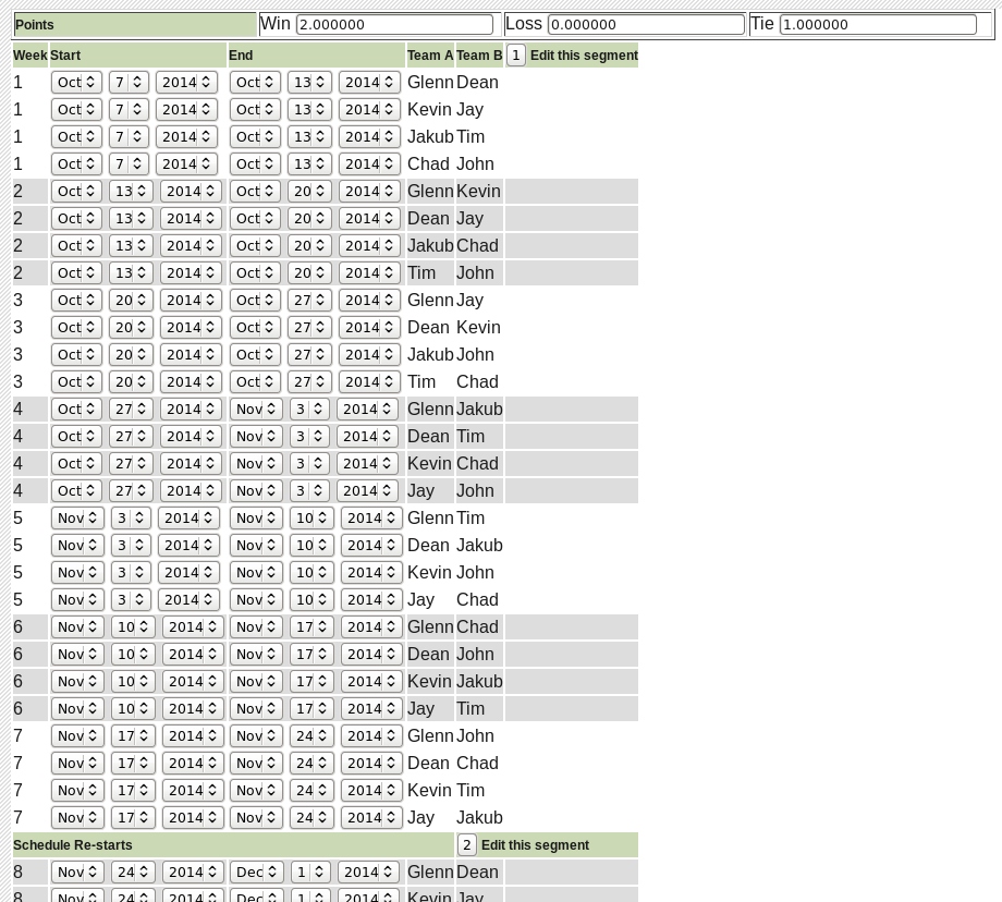 A schedule where all teams meet every other team is generated with a schedule break marker where the matchups repeat. In pools with an odd number of poolies, one (different) team each week will be idle. You can edit each segment by clicking on the button next to the Edit this segment. Points for the results of the matchups can be set at the top of this page.