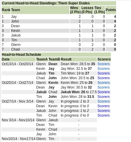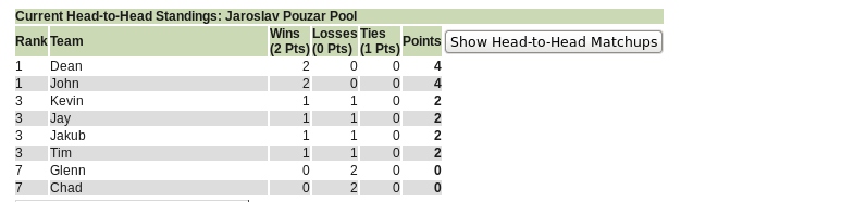 Once the schedule and points are set, then the Head-to-Head standings will appear on the Daily Stats Page instead of Current Standings (which are irrelevant for this type of pool. There is also the link to Show Head-to-Head Matchups