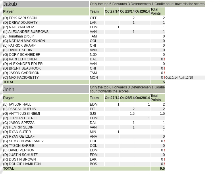 The Scorers page for each matchup shows how each player has scored on each day. Top Scorers pools (Top Scorer notice at top of chart and red exclamation marks next to player scores) and Trades are respected (date ranges).