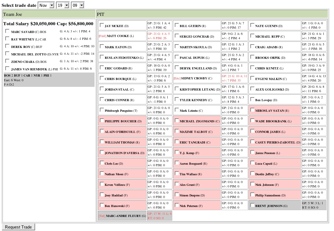 The player list expands so that the currently active players on Joe's team are selectable, and the available players from the Pens are listed and selectable on the right.