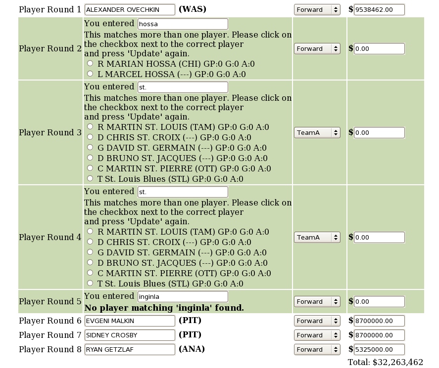 After pressing the 'Update' button, you will see the above results. We see that we made a typo on the fifth player's name, and we have multiple matches found for some of the other players.
